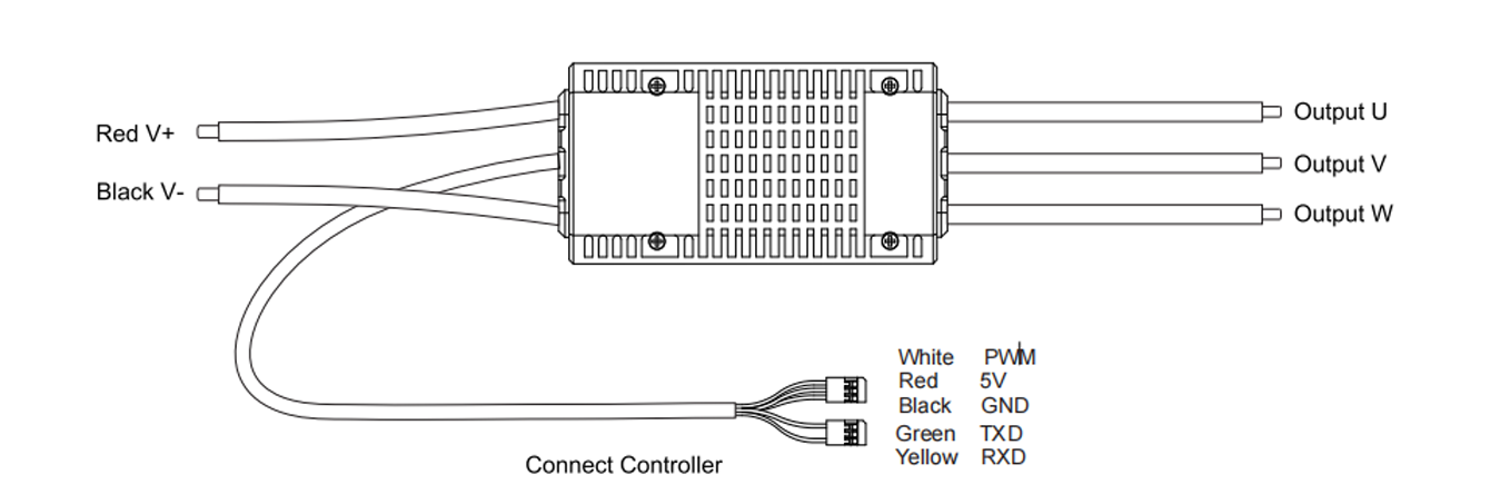 *Follow the provided wiring schematic for correct installation. Key connections: Red/Black (8AWG) for battery input, three Black wires (10AWG) for the motor, and the shielded signal cable for control and data (PWM, 5V, GND, TXD, RXD).*